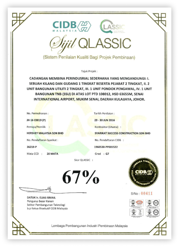 “We sincerely thank you for your outstanding and conscientious effort as well as sense of responsibility in constructing and progressing into the completion of the splendid building of Asahi Best Base Sdn. Bhd. within the contract term.”